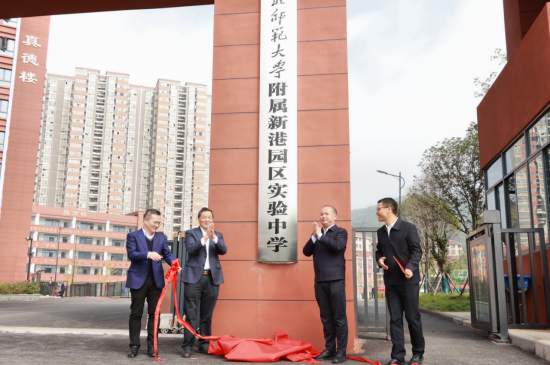 在黄石新港实验中学师生代表的共同见证下,程艳民、梅浩、雷儒金、胡艳军为“湖北师范大学附属新港园区实验中学”揭牌。
